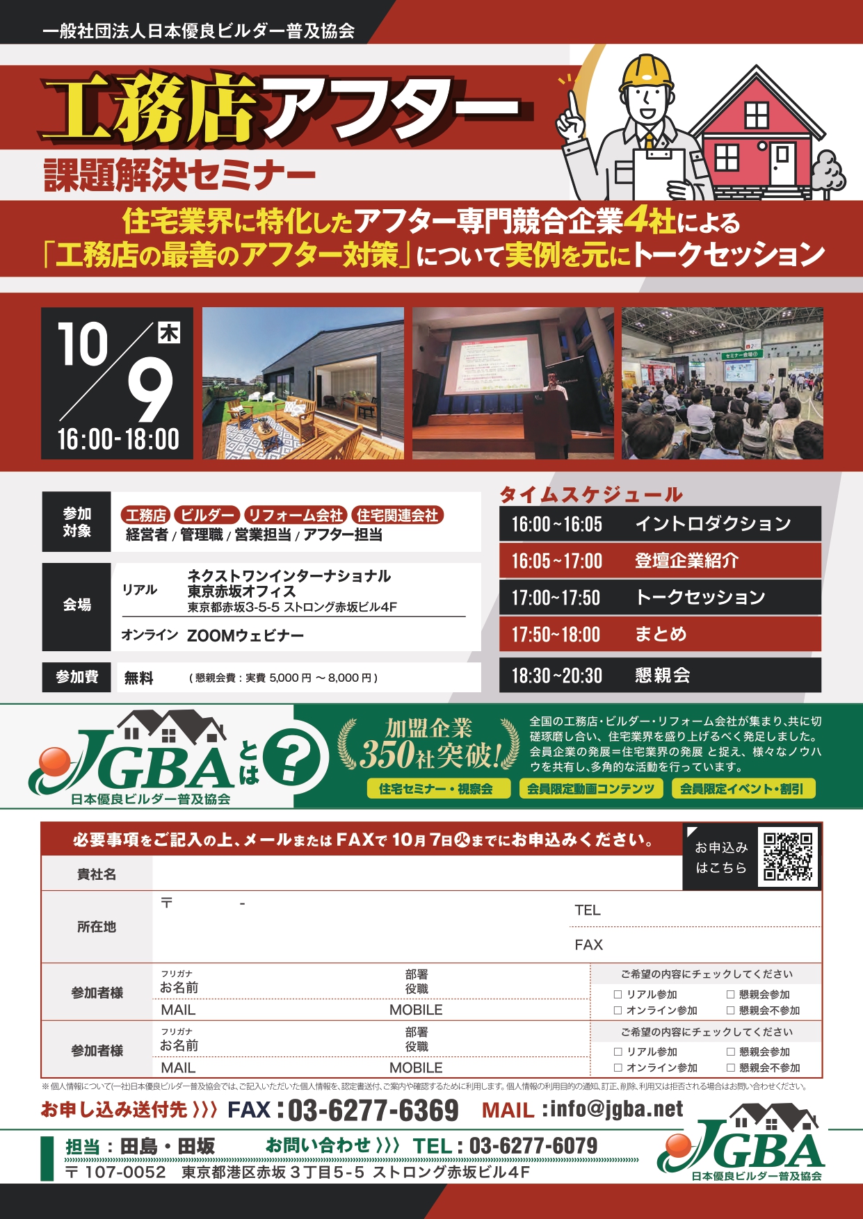 2025年10月9日(木)『工務店アフター課題解決セミナー~住宅業界に特化したアフター専門競合企業4社による「工務店の最善のアフター対策」について実例を元にトークセッション~』