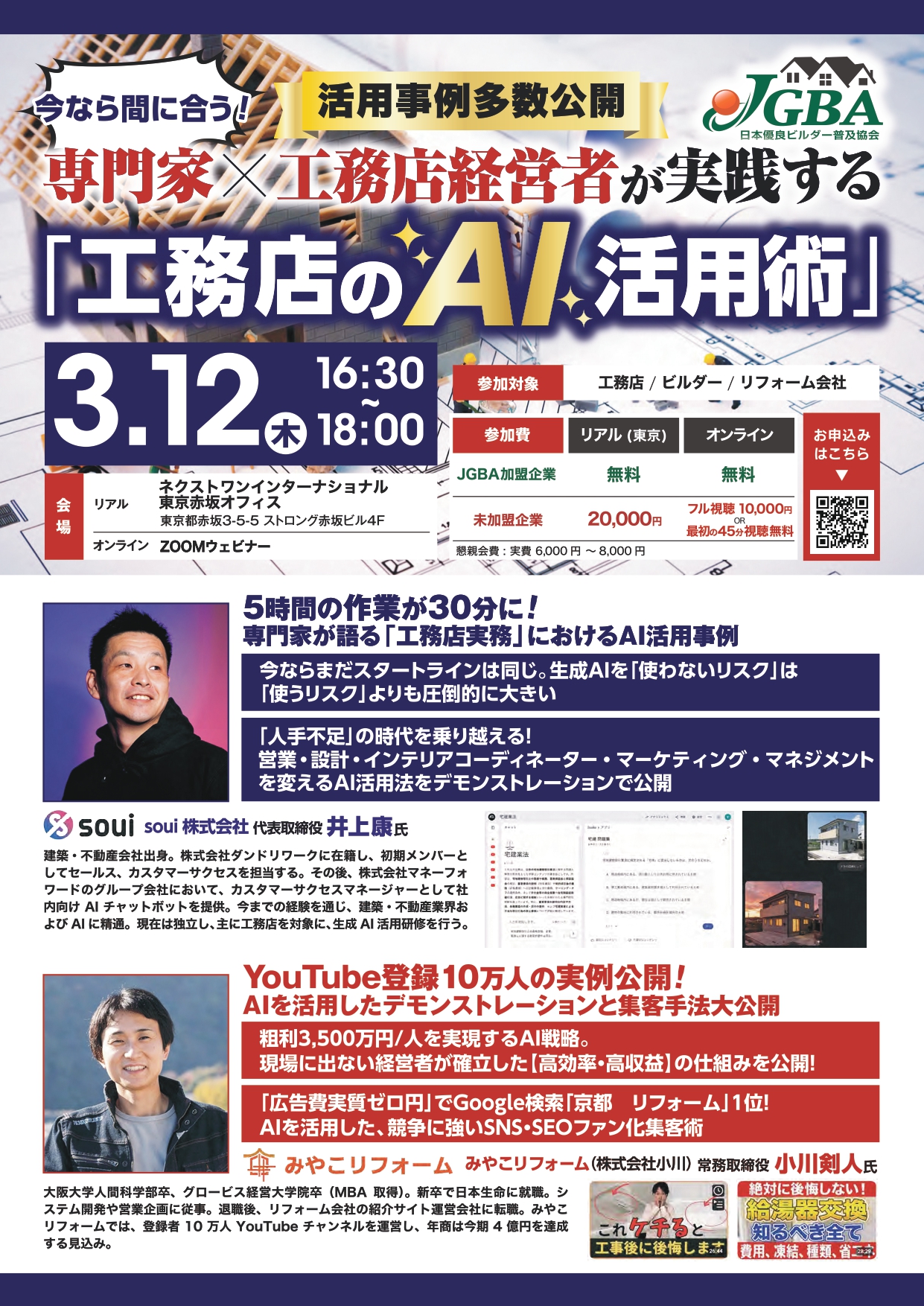 本セミナーでは、soui株式会社 井上社長と、みやこリフォーム(株式会社小川)小川常務にご登壇いただき、AI専門家と工務店経営者それぞれの立場から、工務店実務におけるAI活用事例をお話しいただきます。AIを活用して工務店の業務効率化や売上向上を実現したい方は、ぜひご参加ください。