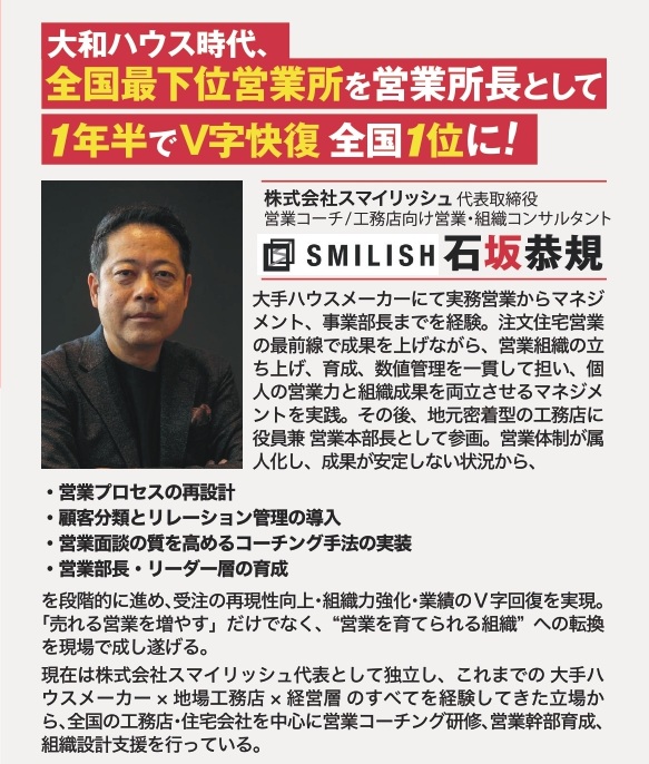 本セミナーでは、株式会社スマイリッシュ 石坂社長にご登壇いただき、住宅営業の「売れる仕組み」の作り方についてお話しいただきます。受注に悩んでいる方、営業育成や仕組みづくりに課題をお持ちの方は、ぜひご参加ください。