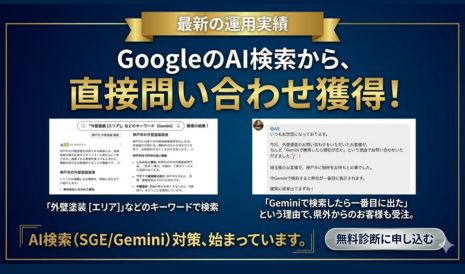 検索のルールが変わりました。MEO(マップ)、SEO、そして最新の「AI検索(SGE)」対策まで全て完結させた次世代型集客支援です。AI×データ分析で商圏内の検索シェアを独占し、ポータルサイトに頼らない「選ばれる工務店」へ。集客のプロが運用を丸ごと代行するため、手間は一切不要。貴社は家づくりに専念してください。