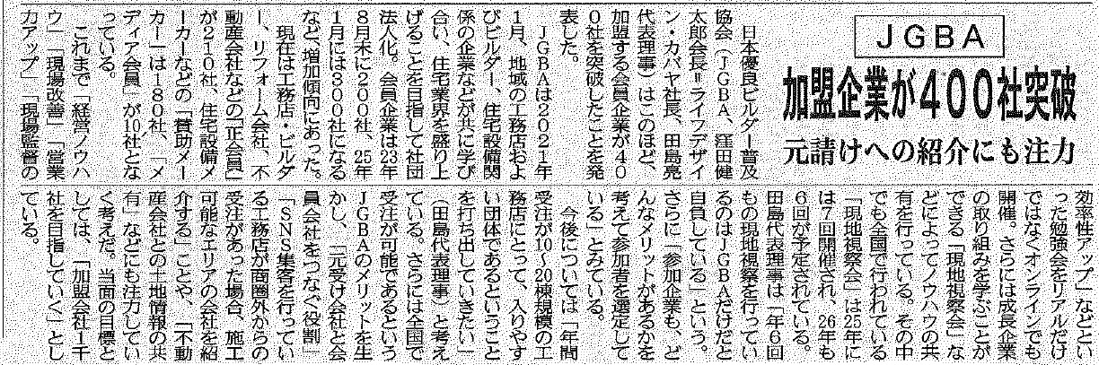 住宅産業新聞(2026年1月20日号)に「加盟企業が400社突破」の記事を掲載いただきました!