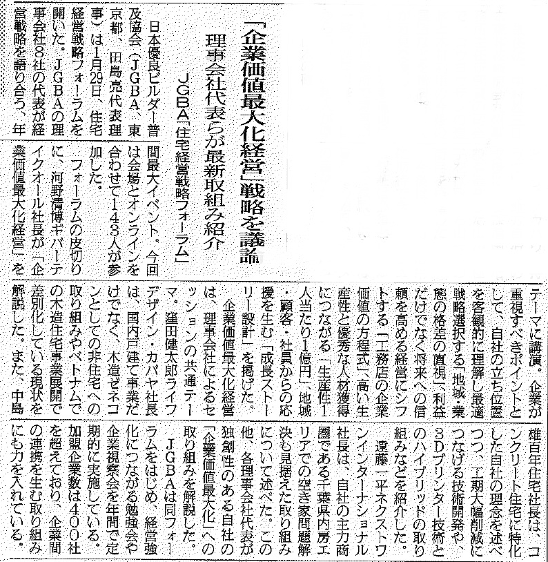 日刊木材新聞(2026年2月4日号)にJGBA「住宅経営戦略フォーラム」の記事を掲載いただきました!