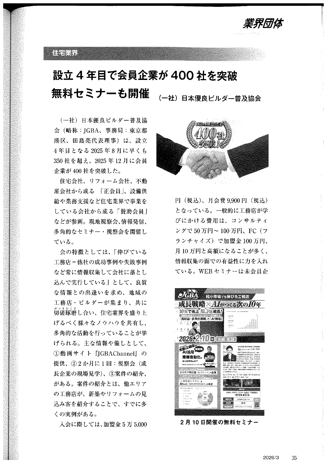 住宅ジャーナル(2026年3月号)に「会員企業が400社を突破 無料セミナーも開催」の記事を掲載いただきました!